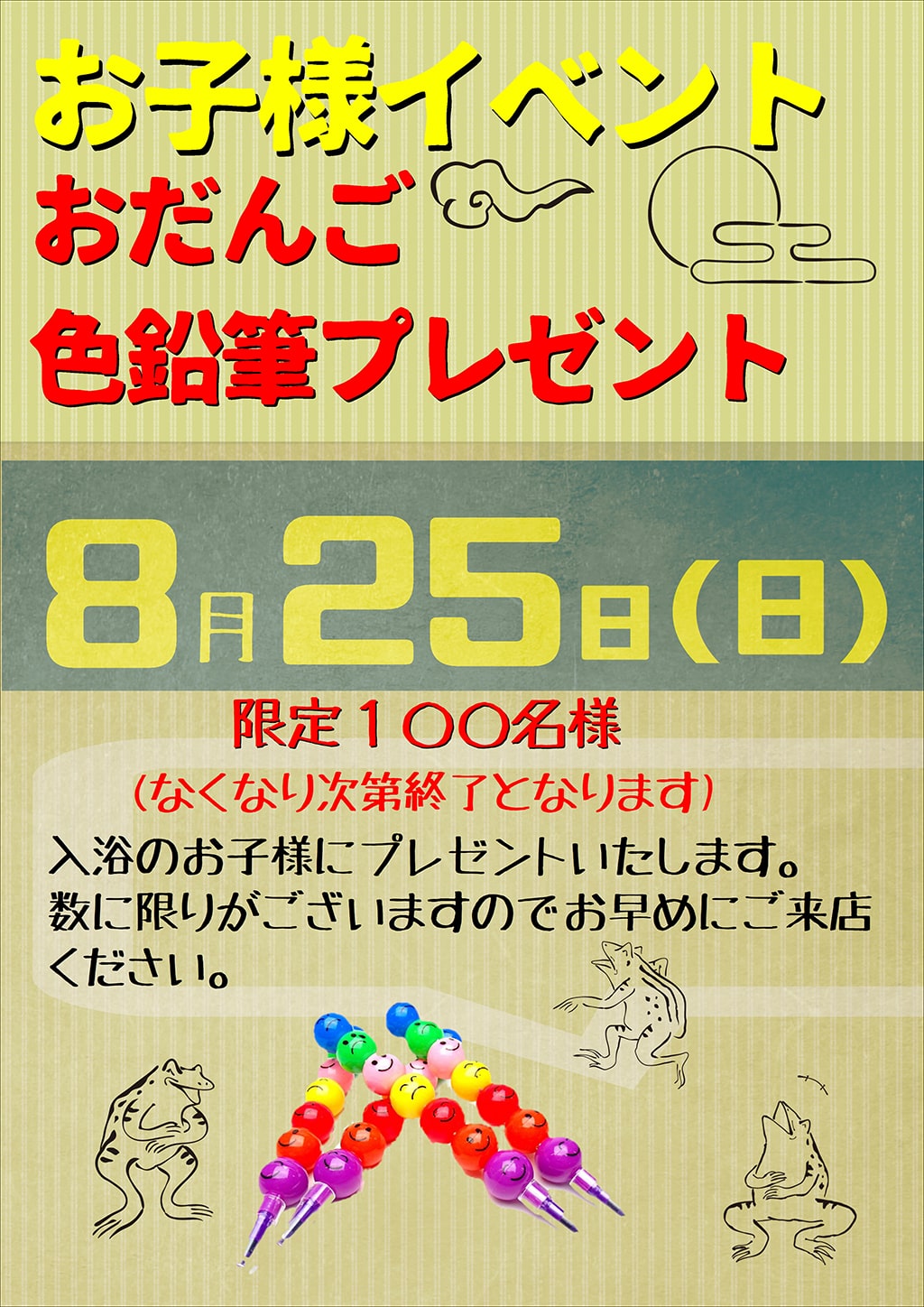 2019年7月30日 / 最終更新日時 : 2019年7月30日 okubo このイベントは終了しました 色鉛筆プレゼント イベント詳細 日付: 2019年8月25日 カテゴリ: このイベントは終了しました お子様イベント 8/25(日) お子様 100名様限定おだんご色鉛筆プレゼント❤ 可愛くて不思議な『おだんご色鉛筆』をプレゼントしちゃいます☆ みんな集まれ~~✨ 暑さに負けずに元気いっぱい過ごしてね!家族みんなで、大きなお風呂を満喫しよう♪♪ ※小学生以下 100名様限定 ※ご入浴のお子様にプレゼントいたします ※数に限りがございますのでお早目にご来店ください共有:Tweet