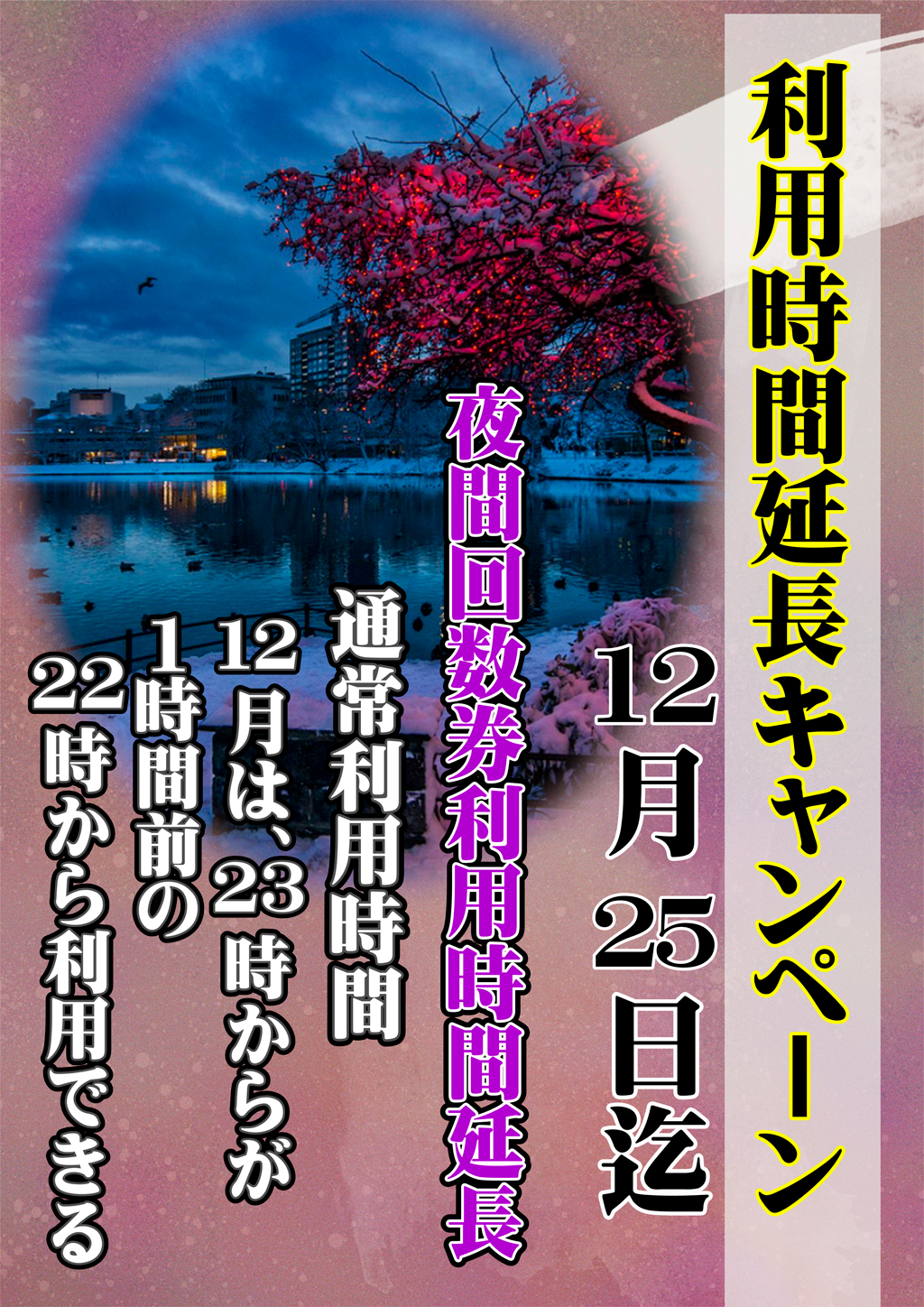 2019年11月29日 / 最終更新日時 : 2019年12月3日 dobashi このイベントは終了しました 利用時間延長キャンペーン イベント詳細 日付: 2019年12月1 – 25日 カテゴリ: このイベントは終了しました 利用時間延長キャンペーン 12/1(日)~12/25(水) 贅沢バスタイムを満喫して、ゆっくり温まりましょ♪ 『夜間回数券』のご利用時間が1時間前倒しになります! 通常23時~ ➡ 22時からご利用できます いよいよ冬到来! 寒い寒~い季節ですが、湯ったりのんびり野天湯元・湯快爽快たやで寛ぎのバスタイムを満喫しましょ! 共有:Tweet