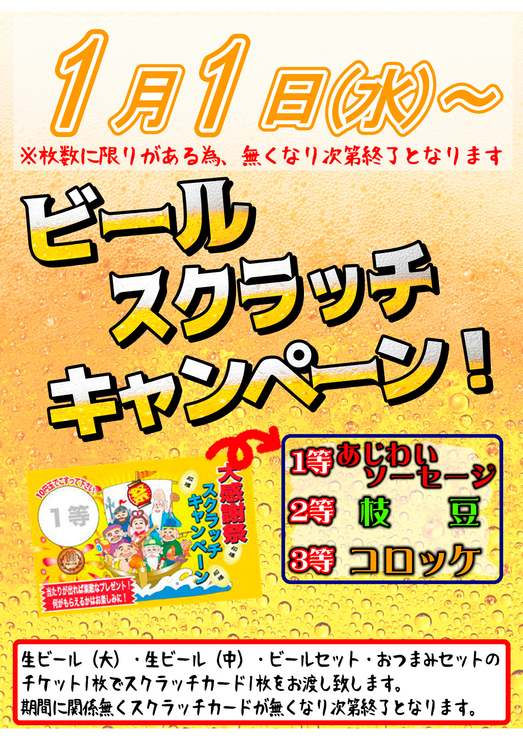 2019年12月27日 / 最終更新日時 : 2019年12月27日 dobashi このイベントは終了しました ビールスクラッチ イベント詳細 日付: 2020年1月1 – 31日 カテゴリ: このイベントは終了しました ビールスクラッチキャンペーン! 1/1(水・祝)~ 新春運試し!数量限定、なくなり次第終了! 期間中、生ビール(大・中)やビールセット、おつまみセットをご注文ごとにスクラッチカードを1枚差し上げます。 何が出るかは削ってからのお楽しみ。 気になる景品は? 美味しいビールとご一緒にドウゾ! 【1 等】あじわいソーセージ 【2 等】枝 豆 【3 等】コロッケ 共有:Tweet