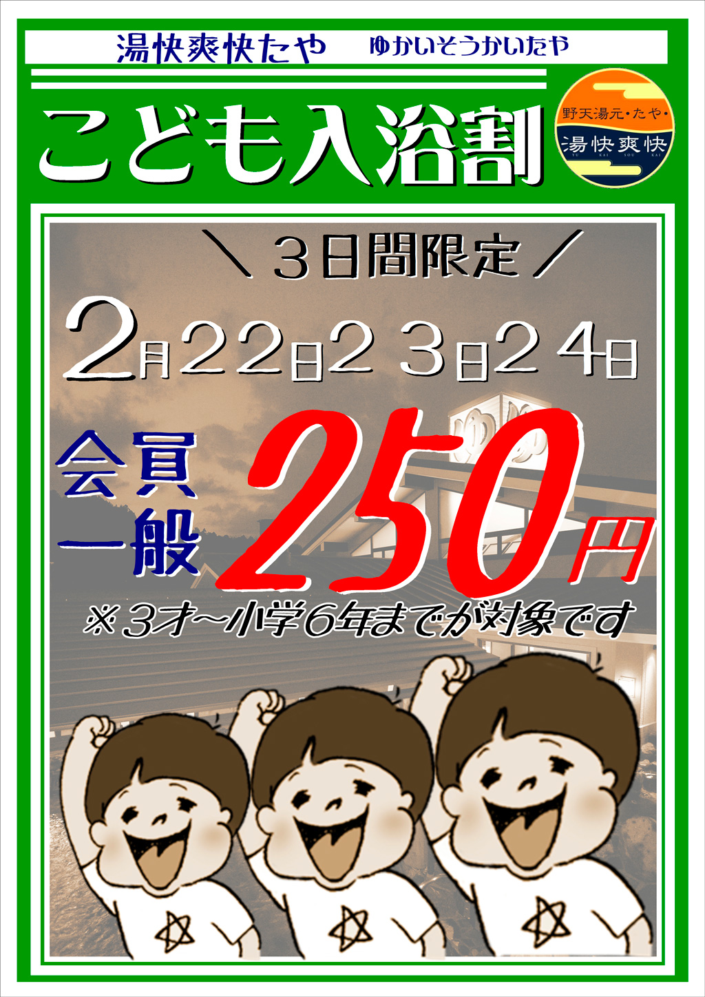 2020年2月3日 / 最終更新日時 : 2020年2月3日 dobashi このイベントは終了しました こども入浴割 イベント詳細 日付: 2020年2月22 – 24日 カテゴリ: このイベントは終了しました こども入浴割 2/22(土)~2/24(月・祝) お子様の入浴料が大変お得に! 2月後半の3連休☆どこにお出かけしますか? たや温泉のお風呂にだって、入りにいらして下さいね♪ お子様の入浴料がお安くなってます! お風呂で親子のコミュニケーションを。 湯快爽快たや店で家族の時間をお過ごしください♡ こども入浴料(土休日) 会員430円/一般480円 → 会員・一般共250円 ※3才~小学6年生までが対象です 共有:Tweet