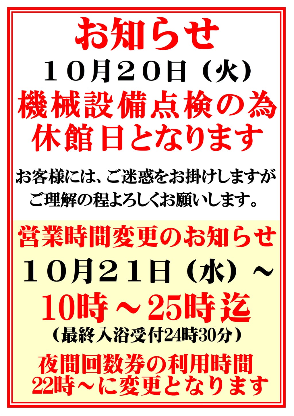 2020年9月23日 / 最終更新日時 : 2020年10月22日 dobashi 休館日 休館日 イベント詳細 日付: 2020年10月20日 カテゴリ: 休館日 お客様各位 日頃より 野天湯元 湯快爽快 たや をご利用くださいまして、誠にありがとうございます。 誠に勝手ながら、10月20日(火)は機械設備点検のため全日休館日とさせていただきます。 尚、翌10月21日(水)は通常通り朝10時より開店いたします。 皆様のご理解とご協力をよろしくお願い申し上げます。 店主 敬白 営業時間変更のお知らせ ■ 10月21日(水)より ■ 10:00~25:00(最終受付24:30) ※夜間回数券のご利用時間も22:00~になります 共有:Tweet
