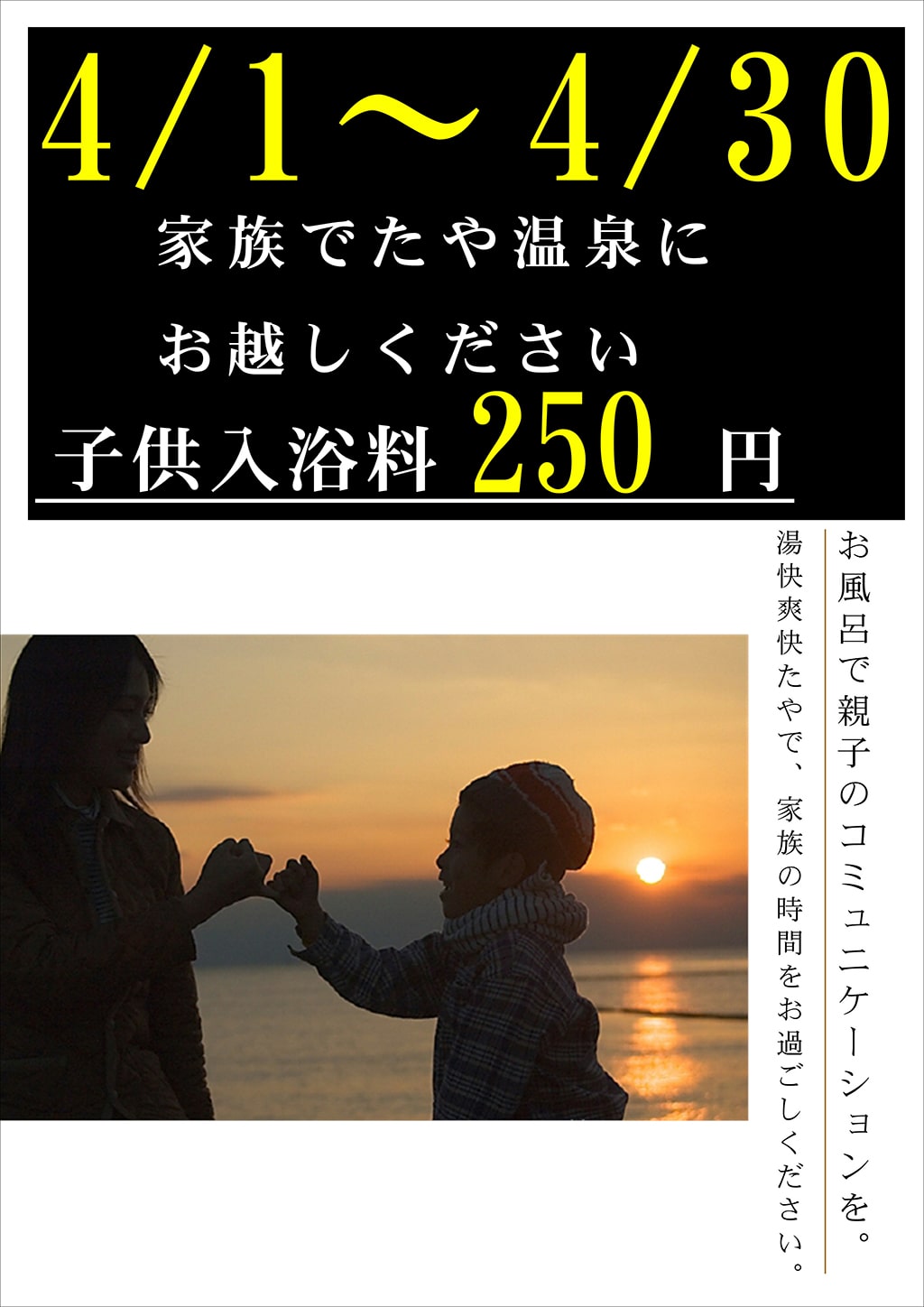 • ご家族のみなさまご一緒にたや温泉のお風呂に入って、リフレッシュして下さいね♪ お子様の入浴料がお安くなってます!