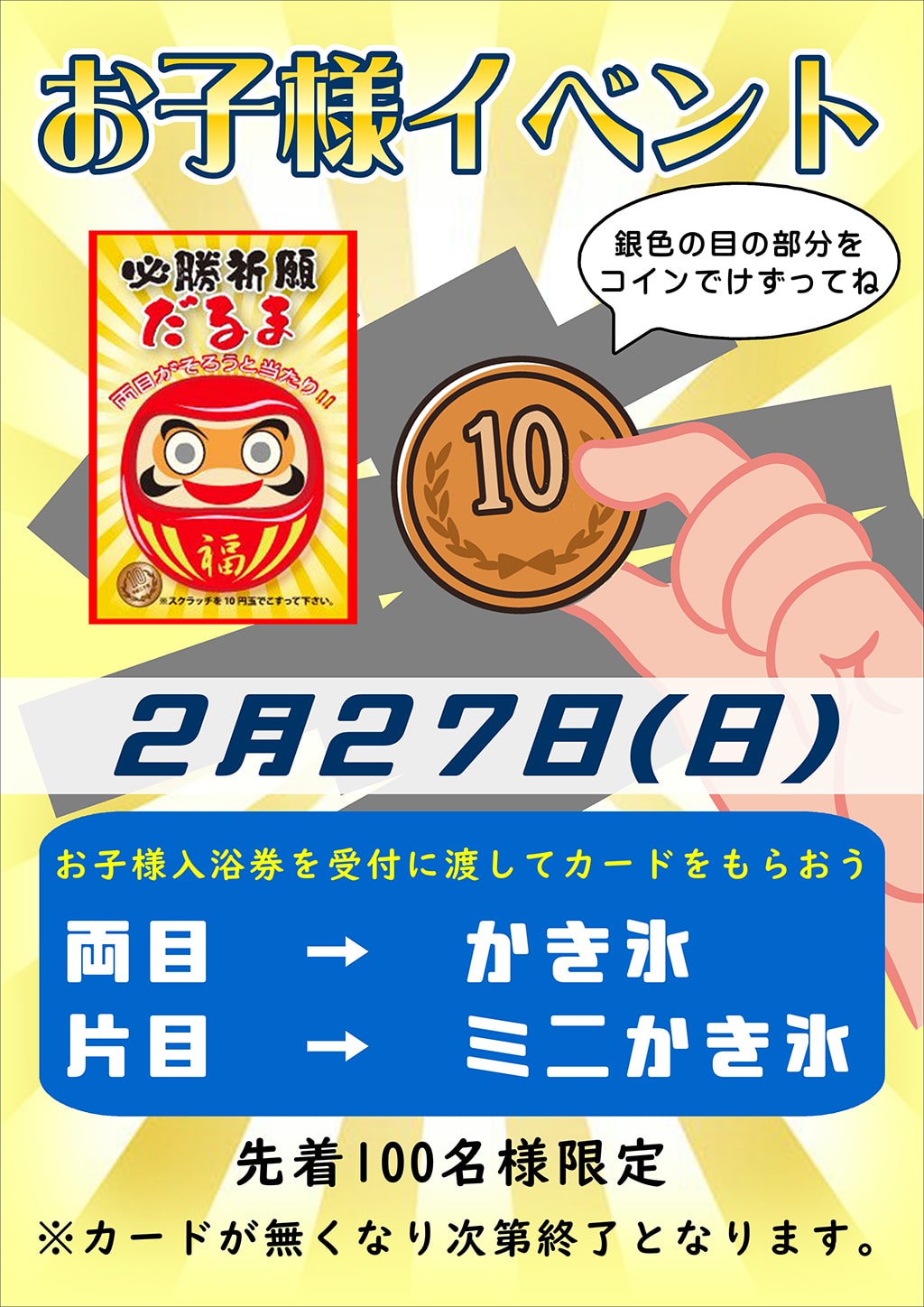 2022年1月28日 / 最終更新日時 : 2022年1月28日 dobashi このイベントは終了しました お子様スクラッチ イベント詳細 日付: 2022年2月27日 カテゴリ: このイベントは終了しました 当たるかな??ダルマさんスクラーッチ!!🤘 お子様限定 チャレンジ★ 2/27(日) ドキドキ!?楽しい運試しに挑戦? 限定100枚だよ!急げ~! 参加方法 🔍 入浴受付でスクラッチ用紙をもらおう! 🔍 だるまさんの目の部分をコインで削ってね! 🔍 だるまさんの目 出てくるかな?? 見事!目が出たら? 👀両目がでたら・・?かき氷 片目だったら・・?ミニかき氷 ご注意 ご入浴された小学生以下のお子様が対象です 共有:Tweet