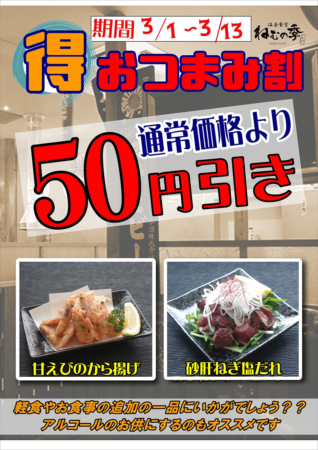 2022年2月25日 / 最終更新日時 : 2022年2月25日 dobashi このイベントは終了しました 得!おつまみ割 イベント詳細 日付: 2022年3月1 – 13日 カテゴリ: このイベントは終了しました 召しませ🍗美味し~いおつまみ♥ 通常価格より50円引き! 3/1(火)~3/13(日) ☆期間限定☆ 酒の肴に人気のおつまみの中から、選りすぐりの逸品を50円引きでお得にご提供しちゃいます🥒 どっちも食べちゃお? 🍗 甘えびのから揚げ 🍗 砂肝ねぎ塩だれ 通常価格から50円割引! 共有:Tweet