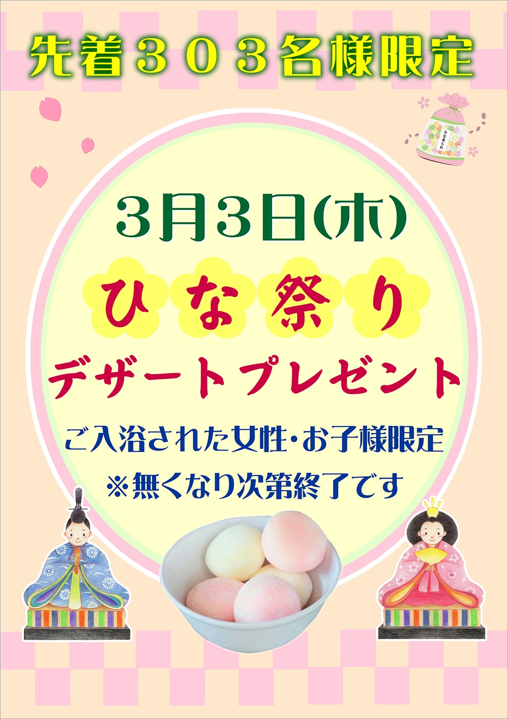 2022年2月25日 / 最終更新日時 : 2022年2月28日 dobashi このイベントは終了しました ひな祭り限定企画 イベント詳細 日付: 2022年3月3日 カテゴリ: このイベントは終了しました 桃の節句❤デザートプレゼント ささやかですが♡ 【ひな祭り企画】 3/3(木) たや店より、日頃のご愛顧に感謝して♫ 素敵なひな祭りになるように、幸せを願ってささやかなお祝いをお贈りします! 《先着303名様》 ☆ご入浴される女性のお客様&お子様に ひな祭りデザートをプレゼント? ( ^v^)!!! 共有:Tweet