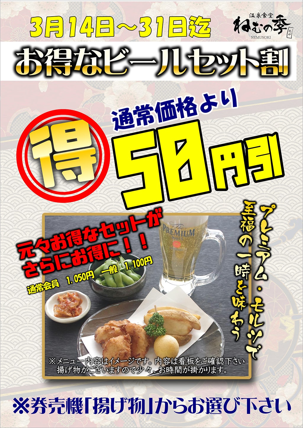 『田谷温泉』、『美味しいビール』、『お得なおつまみセット』