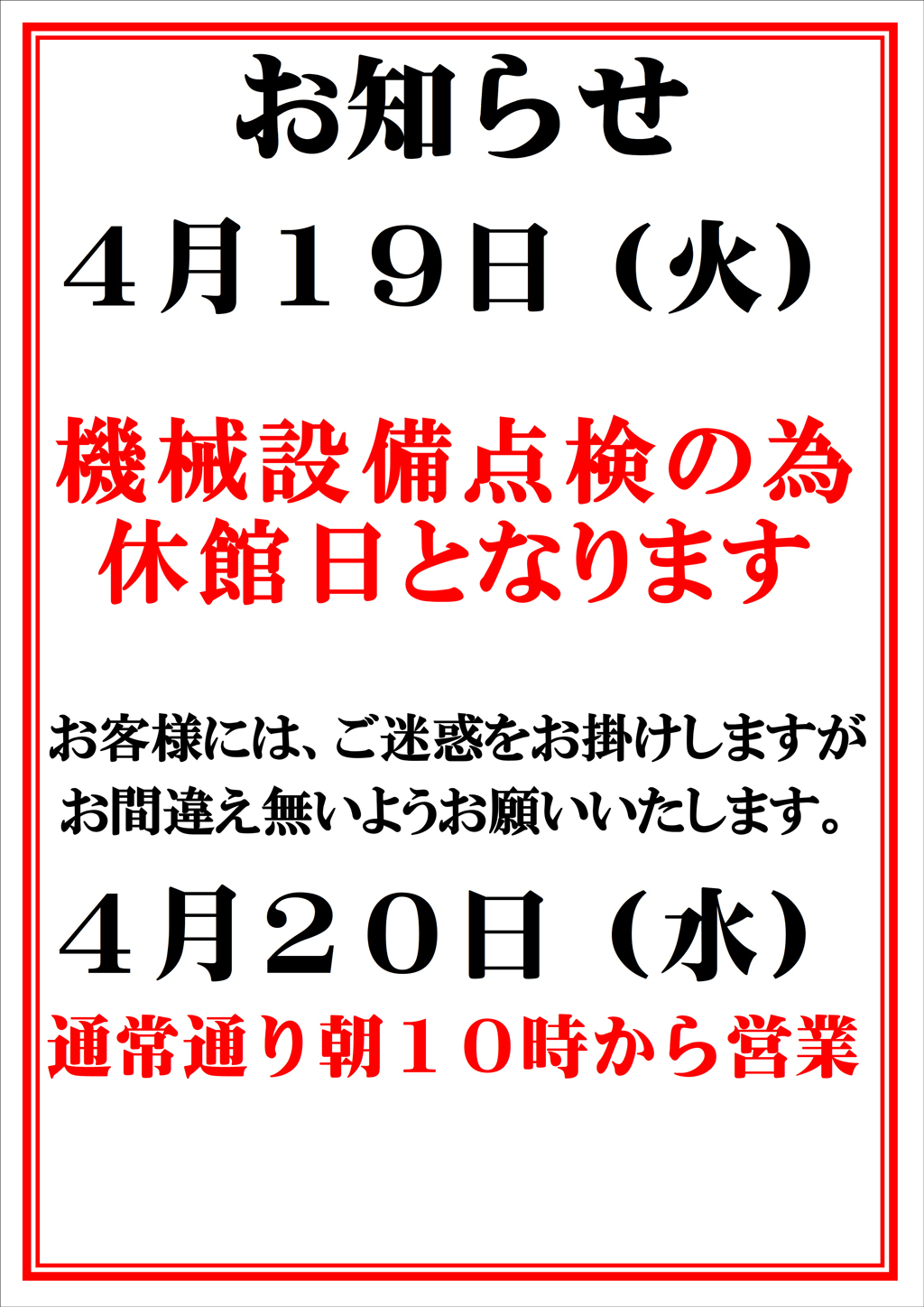2022年3月30日 / 最終更新日時 : 2022年3月30日 okubo 休館日 休館日 イベント詳細 日付: 2022年4月19日 カテゴリ: 休館日 お客様各位 日頃より 野天湯元 湯快爽快 たや をご利用くださいまして、誠にありがとうございます。 誠に勝手ながら、4月19日(火)は機械設備点検のため全日休館日とさせていただきます。 尚、翌4月20日(水)は通常通り朝10時より開店いたします。 皆様のご理解とご協力をよろしくお願い申し上げます。 店主 敬白 共有:Tweet