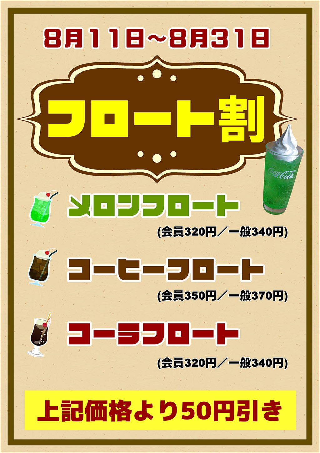 お風呂上りにもウレシイ!みんな大好き!フロートが今なら割引価格にてご提供♪