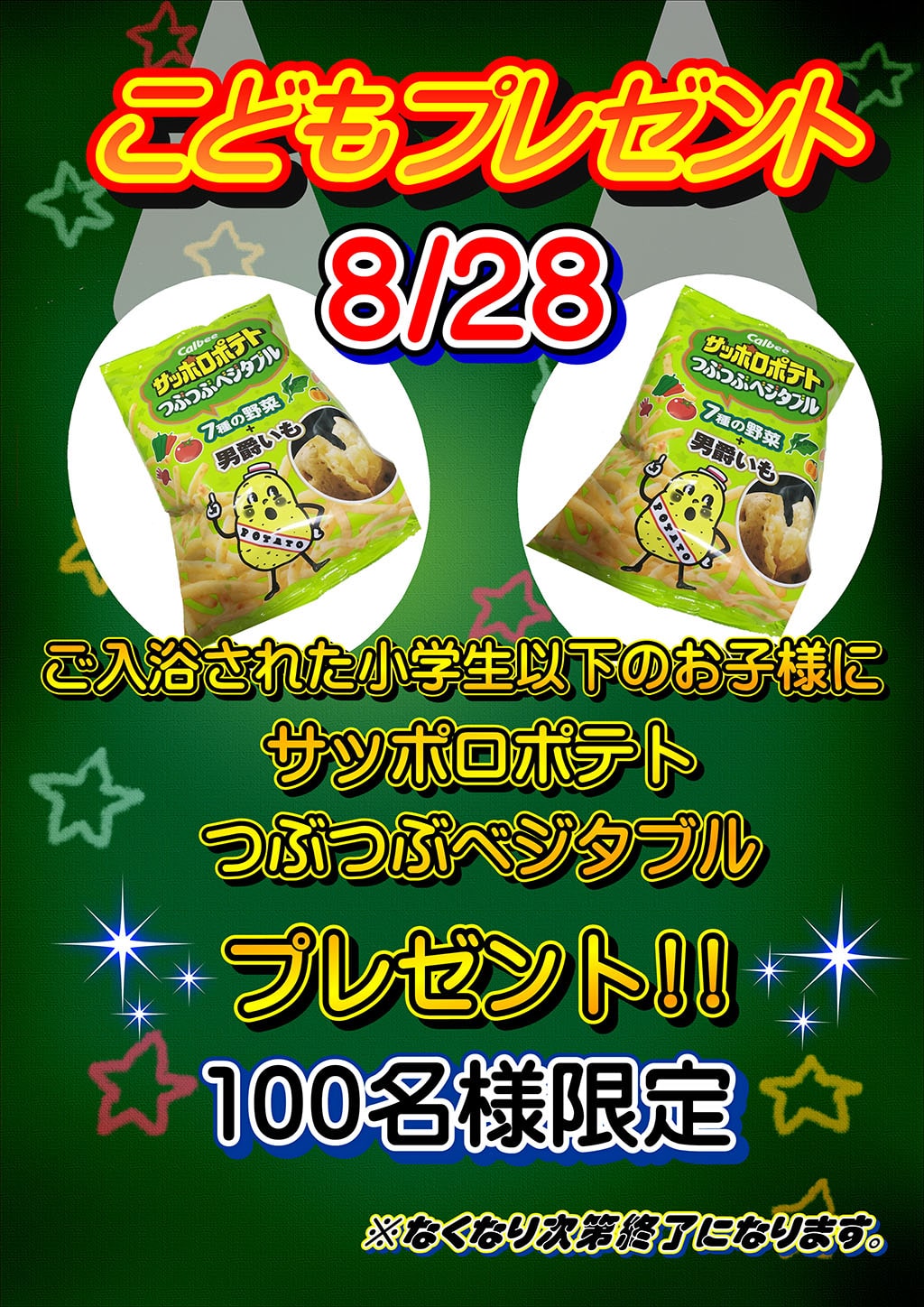 2022年8月1日 / 最終更新日時 : 2022年8月1日 dobashi お子様限定 お子様プレゼント企画 イベント詳細 日付: 2022年8月28日 カテゴリ: お子様限定 先着100名!!サッポロポテトプレゼント! 休日は家族みんなで湯快爽快! 8/28 (日) 数量限定 ご入浴された小学生以下のお子様先着100名様に ☆サッポロポテトつぶつぶベジタブル☆をプレゼント✨ 夏休み最後の日曜日。今日はお風呂でのんびりしようか~♨ ご注意 ご入浴の小学生以下100名様限定 数に限りがございますのでお早目にご来店ください 共有:Tweet