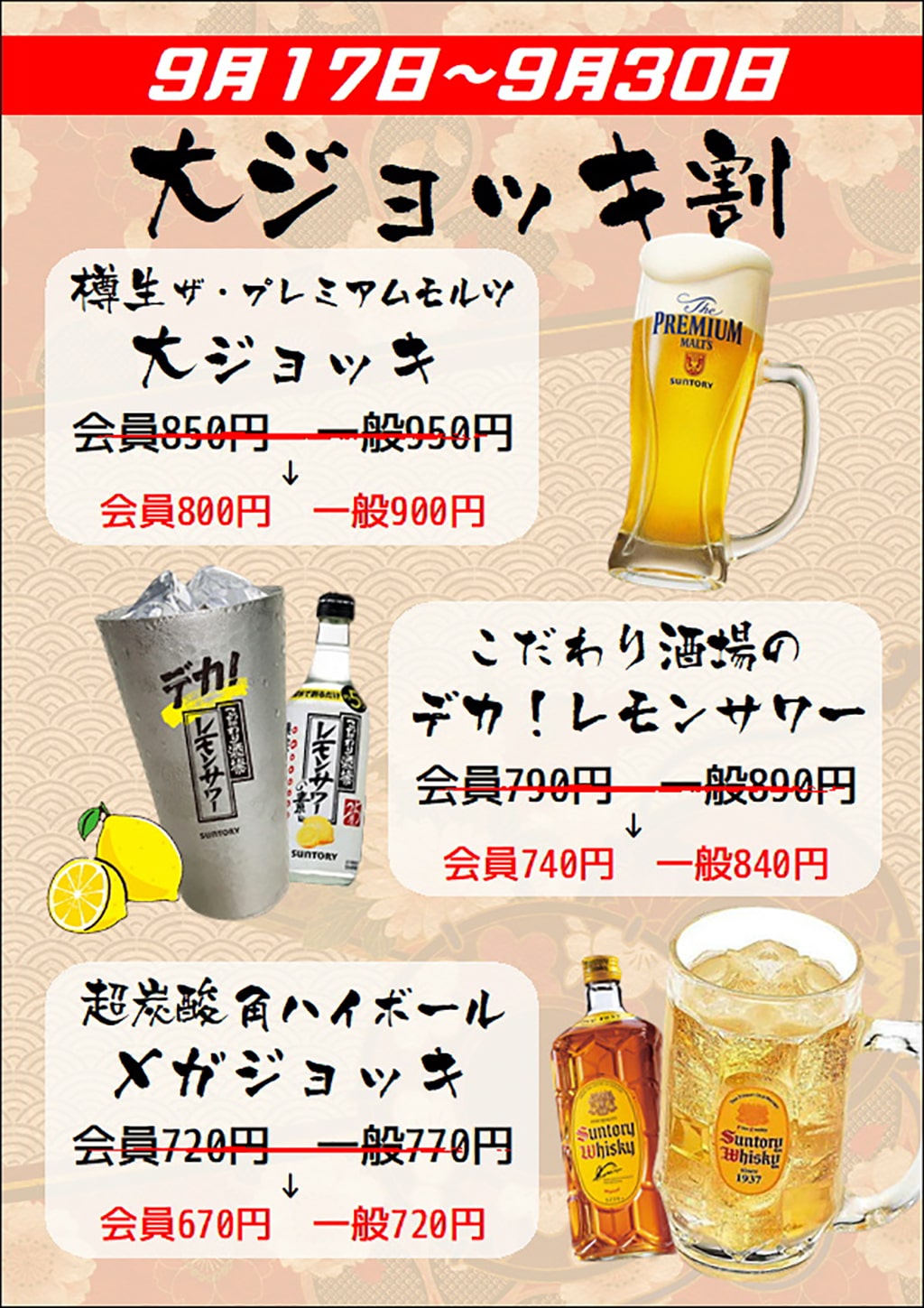 9/17(土)~9/30(金) 📣禁断のBIGサイズ50円引き? 量は大きく🍻負担は小さく💸❤ お風呂上りにBIGサイズの美味しい大人のドリンク?をグイっと♡いただいちゃいましょう♪ たや温泉のお食事処『温泉食堂ねむの季』自慢のおつまみと一緒に美味しく味わってくださいませ! ☆お風呂上りは、まずはコレでしょ!☆ ザ・プレミアムモルツ《大ジョッキ》 ハイボール《メガジョッキ》 《デカ》レモンサワー 超お得PRICE! 50円引き!