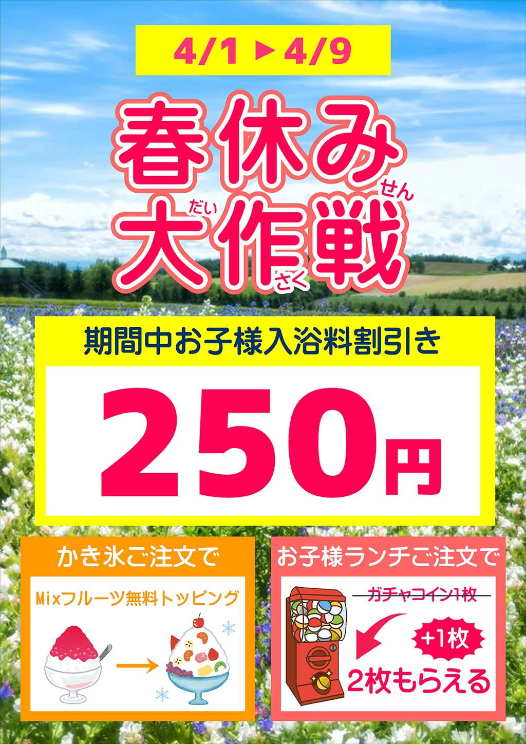 4/1(土)~4/9(日) お子さまが大変おトク? 📣今だけ☆おひとり250円! たや温泉で家族団欒 春休みを満喫しよう? ご家族みんなで♪たや温泉にいらしてね♨ かき氷ご注文で✨ ヒンヤ~リ?1!2!3!Mixフルーツ無料トッピング👍 お子さまランチご注文で✨ ガチャコイン?2枚もらえちゃう~?