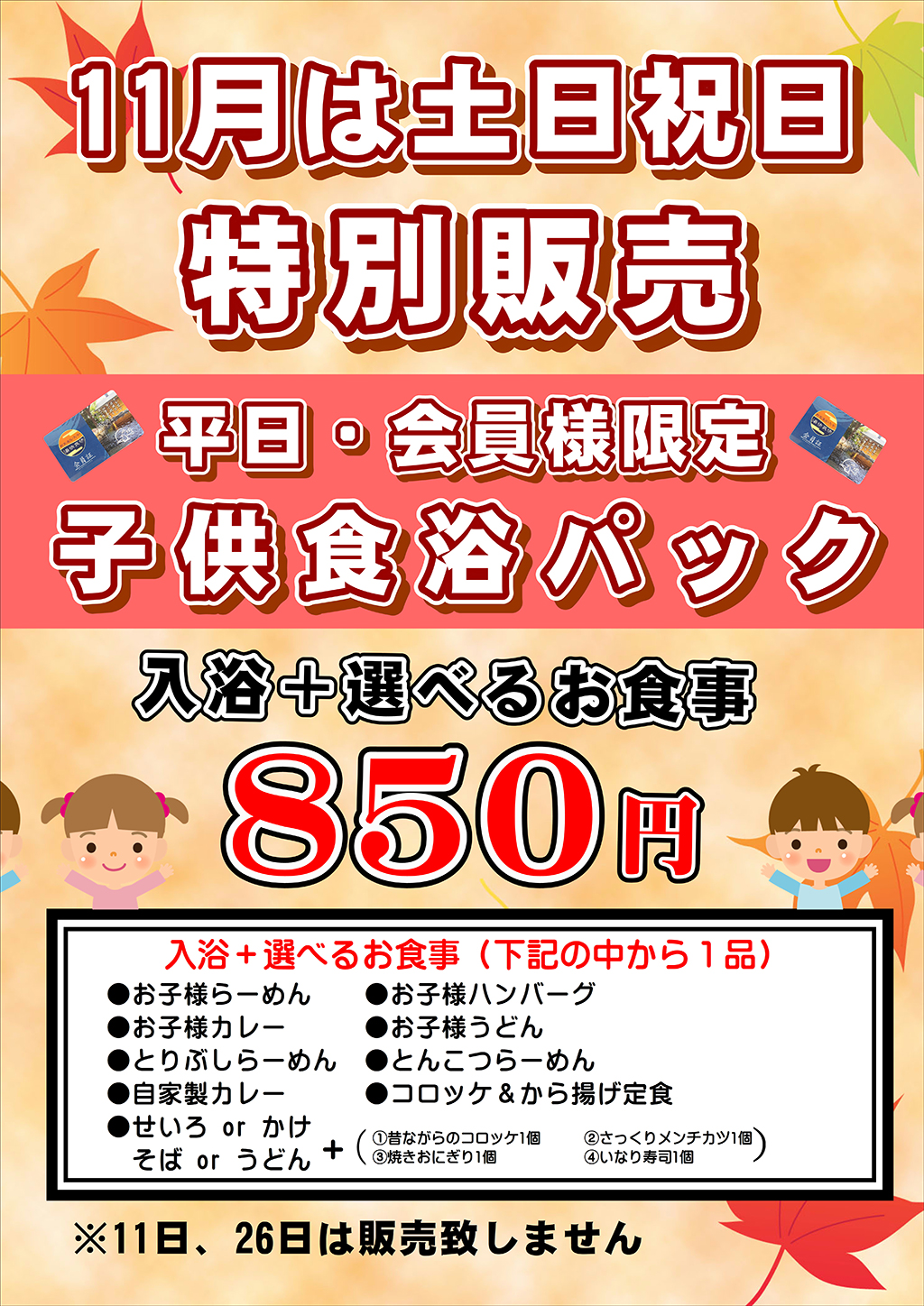 通常は平日限定で開催している子ども食浴パック11月限定特別に土日祝も販売します!