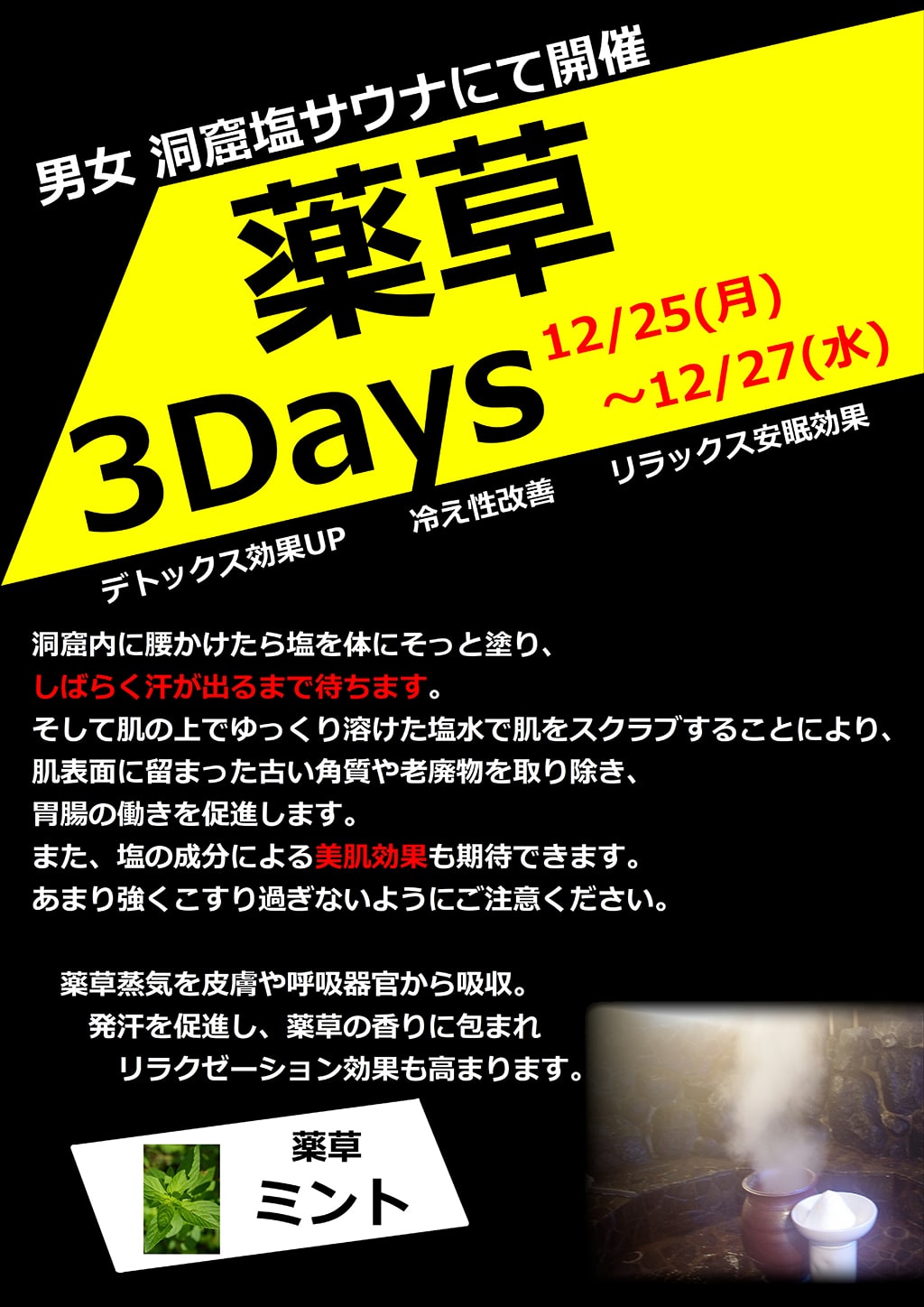 12/25(月)~12/27(水) デトックス&免疫力アップ!! 男女とも『巣窟塩サウナ』にて3日間、薬湯蒸を実施します。 たや温泉の薬草蒸で、ゆったりのんびり元気をチャージしてくださいね♨ 近所の湯治場♨田谷温泉 薬草蒸 ミント リラックス安眠効果 冷え性改善 デトックス効果UP!!