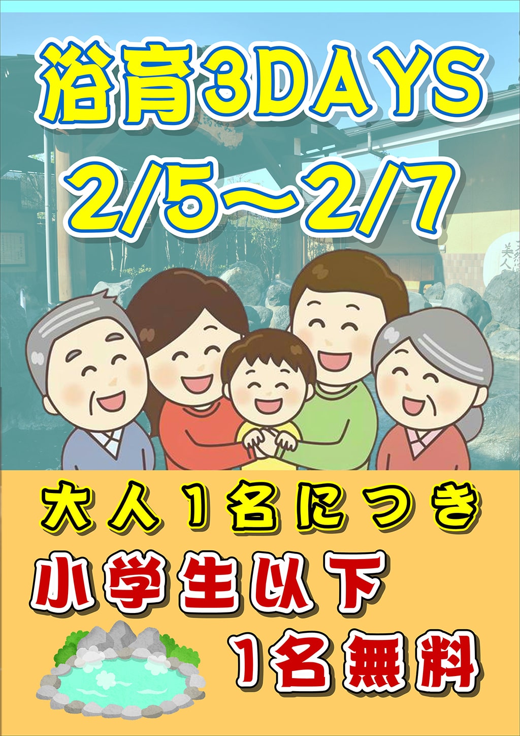 2024年1月31日 / 最終更新日時 : 2024年2月5日 okubo このイベントは終了しました 浴育3Days イベント詳細 日付: 2024年2月5 – 7日 カテゴリ: このイベントは終了しました 3日間限定 2/5(月)~2/7(水) 家族で大きなお風呂👨👩👧👦 無料ですから✨ どこ行く💁♂️➡たや温泉♨➡え!?➡はい!家族で👩👦👨👦 🎊大人1名につき、お子様1名📣 無料* 小学生以下のお子様に限ります たや温泉はご家族皆さまでの来店がとってもお得! ご夫婦でのご来店なら2名まで、お爺ちゃんお婆ちゃんもご一緒なら・・・ みんなで大きなお風呂に入ったら、楽しい楽しい家族団欒♪ 思い出の一つになるよね!(^^)! 共有:Tweet