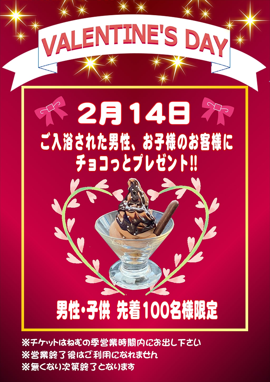 《1日限定》 2/14(水) Happy Valentine’s Day♡ 先着100名様限定! ご入浴の男性&お子さまに✨ お食事処でチョコっとお楽しみをご用意しています💕 🌟日頃の感謝を込めて🌟 ご注意 チケットはお食事処『ねむの季』営業時間内にお出しください 営業終了後はご利用になれません 無くなり次第終了となります