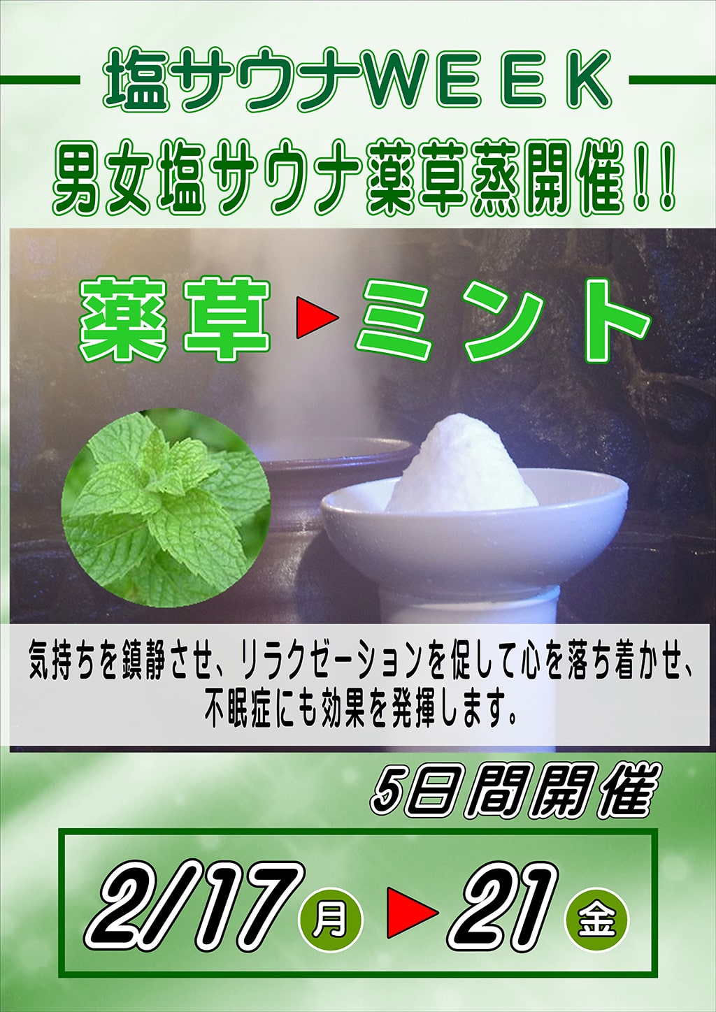 2/17(月)~2/21(金) 📣季節の変わり目🍄 特別な塩サウナで癒されようよ! 癒しのひとときを お肌がつるつるに 老廃物の除去 副交感神経が刺激される 🍃薬草蒸も同時開催🍃 今月の薬草 ミントストレスを軽減させ、睡眠の質を向上させることも期待できます
