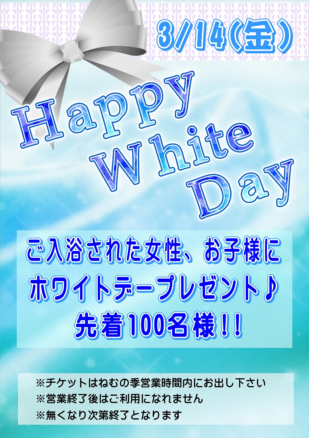 3/14(金) White Day Event 📣ご入浴された女性&お子さまに ホワイトデープレゼント🎁✨ 先着100名 ご注意 チケットはねむの季 営業時間内にお出しください 営業終了後はご利用になれません なくなり次第終了となります