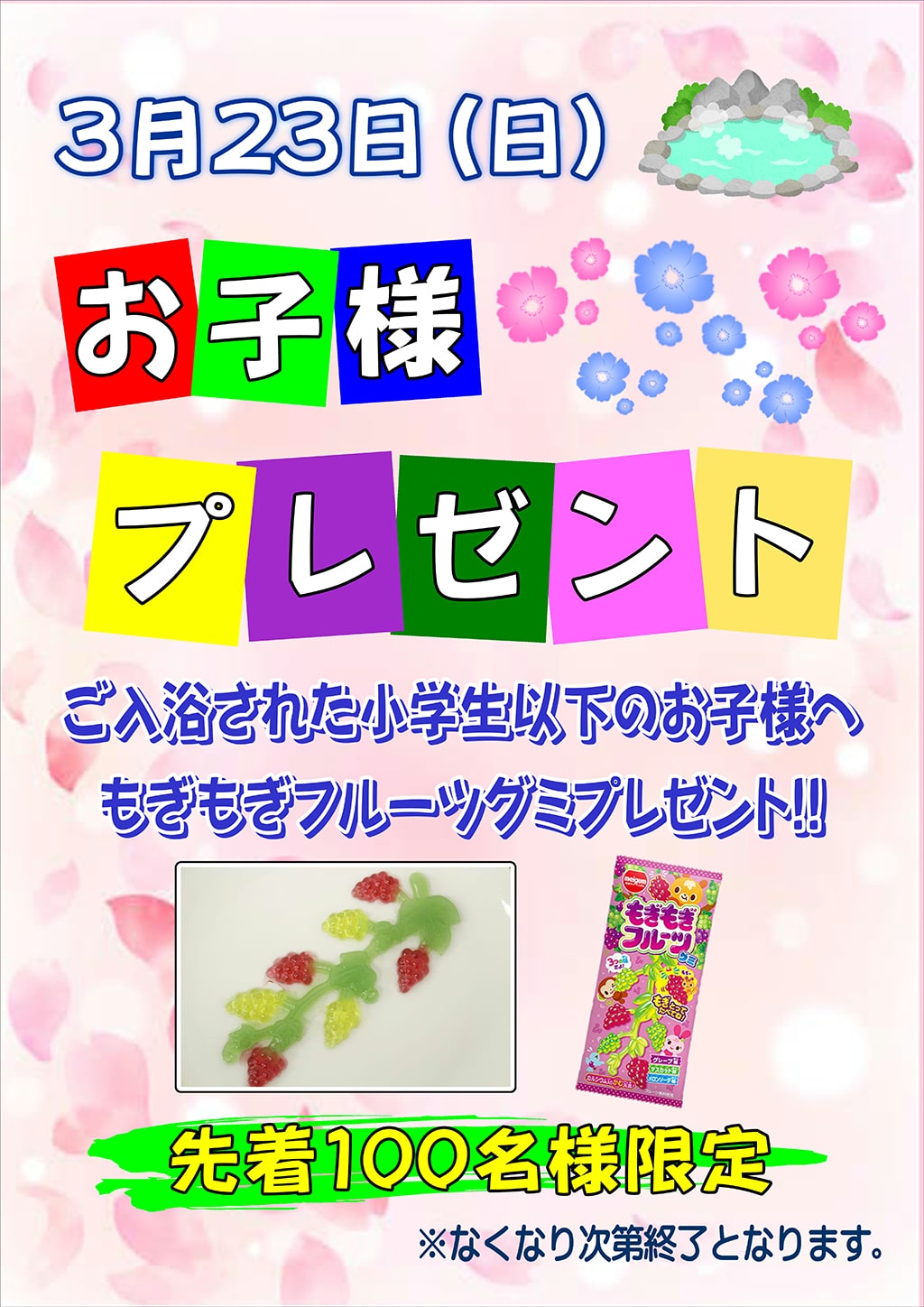 3/23(日) White Day Event 📣ご入浴された小学生以下のお子さまに もぎもぎフルーツグミをプレゼント🎁✨ 先着100名 ご注意 小学生以下のご入浴のお子様にプレゼントいたします なくなり次第終了です