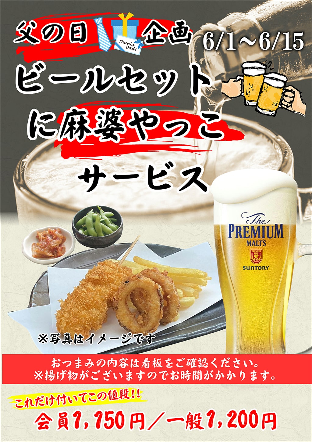 2025年5月29日 / 最終更新日時 : 2025年5月29日 okubo このイベントは終了しました 父の日企画 イベント詳細 日付: 2025年6月1 – 15日 カテゴリ: このイベントは終了しました 6/1(日)~6/15(日) お父さんありがとう企画 お父さんに感謝して✨ 期間限定 ビールセットにさらに!麻婆やっこサービス! お値段そのまま! 共有:Tweet