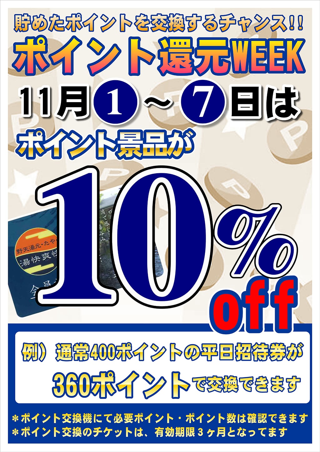 1週間限定11/1(土)~11/7(金) 📣ポイント交換 10%OFF! 貯まったポイント交換する?なら絶対今!🚀 会員ポイント、貯めっぱなしになっていませんか? 期間限定で、景品交換ポイントが10%OFFになります! 例えば、通常400ポイントで交換できる平日招待券が・・・ 今なら10%offの360ポイントでゲットできちゃう♥んです~。 他にも! 貯まったポイントはかき氷やレンタルタオル、生ビールなどなどと交換できちゃいます♪ 『ポイント特典』をチェック👀してみてくださいね!! ポイント特典はコチラ ご注意 現在のポイント数は館内の「ポイント交換機」にてご確認できます ポイント交換のチケットは有効期限3ヶ月となります