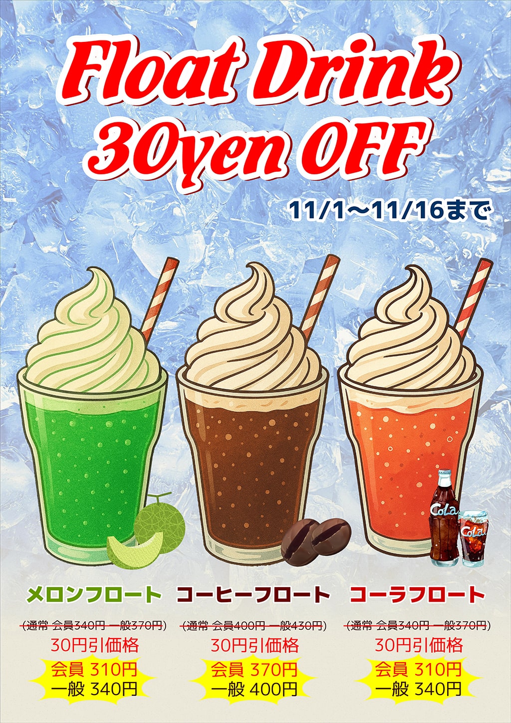お風呂上りにもウレシイ!みんな大好き!フロートが今なら割引価格にてご提供♪ ちょっと贅沢なドリンクをお楽しみください!