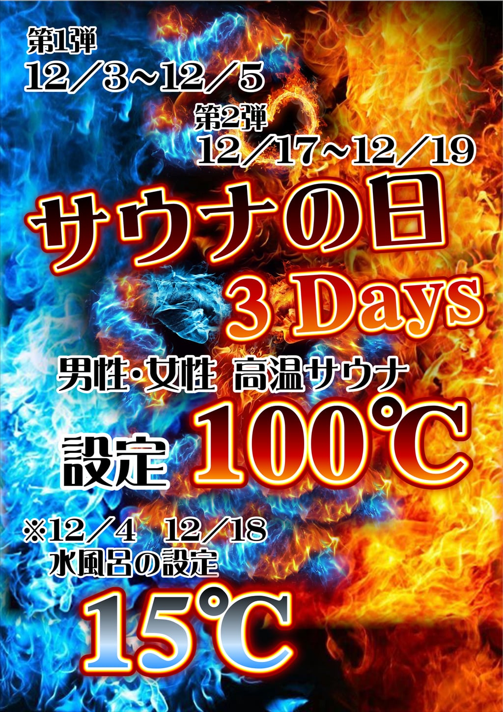 12/17(水)~12/19(金) 📣たや温泉でととのい体験!滝汗100℃🔥 ドバッと噴き出る汗💦💦💦でリフレッシュしましょう! SAUNA 3Days 期間中 🔥高温サウナが100℃に! しっかりと『ととのう』ために最適な温度を、ととのえてお待ちしております。 🌊 12/18(木)限定 水風呂が15℃設定♡ 高温のサウナには水風呂が大事! しっかりと『ととのう』ために水風呂も、ととのえてお待ちしております。