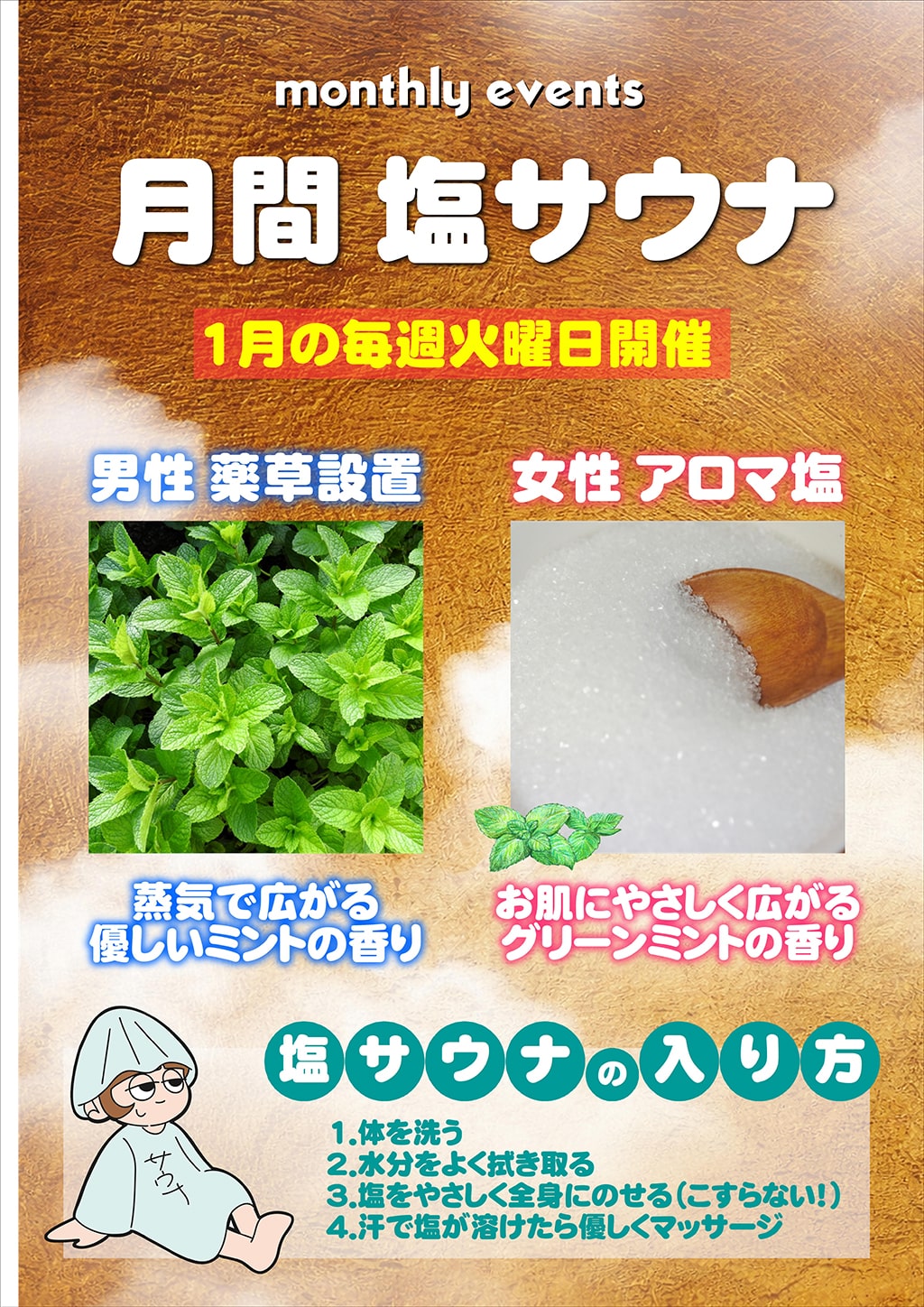 1月の毎週 火曜日 1/6, 13, 20, 27 新春🎍 2026年も特別な塩サウナで癒されようよ! 🍃薬草蒸も同時開催🍃 お肌がつるつるに 老廃物の除去 副交感神経が刺激される 癒しのひとときを 月間 塩サウナの日 ミントの香り 気持ちを鎮静させ、リラクゼーションを促して心を落ち着かせ、不眠症にも効果を発揮します。