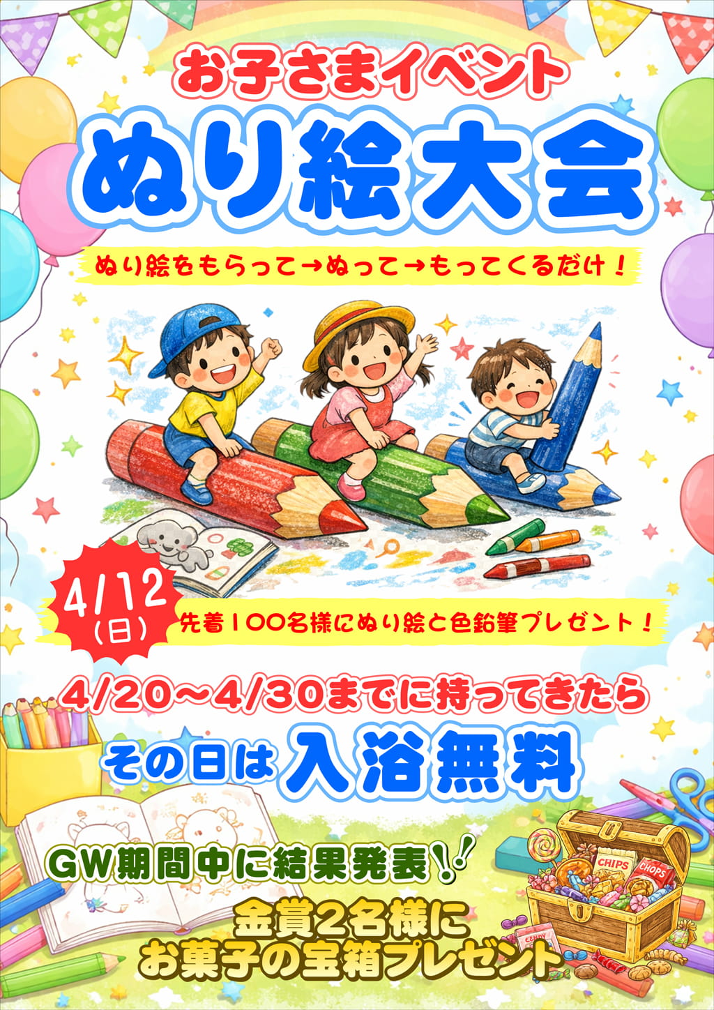ステップ1まずは、4/12(日)にぬり絵と色鉛筆をGET! 配布はご入浴のお子さま先着100名様限定✨