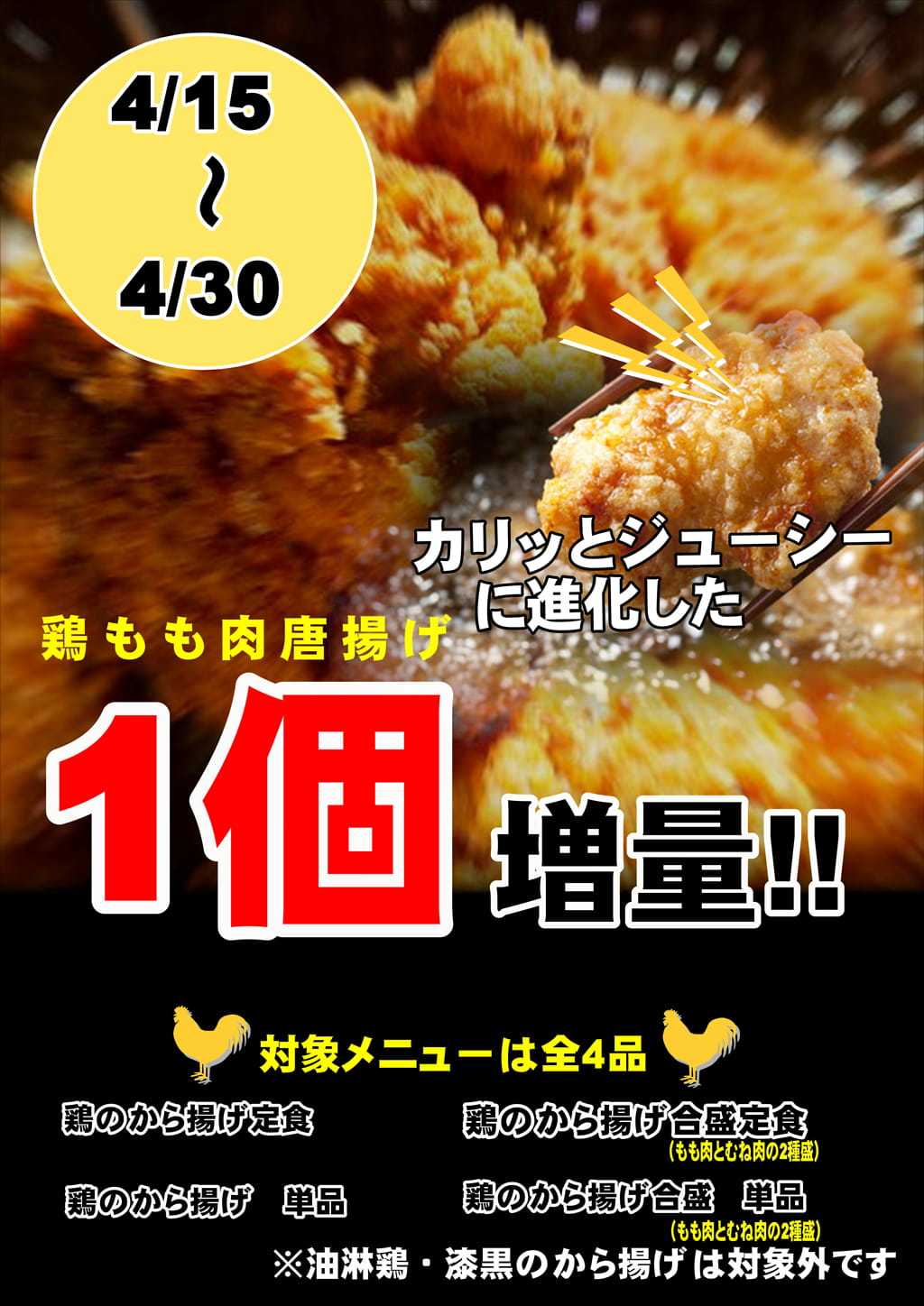 4/15(水)~4/30(木) コレ食べてってね~🐓 オマケだよ さあ、召し上がれ🎵 田谷温泉でスッキリ♨サッパリした後は☆お得にお腹も満たされちゃお🍙 ✨1個増量中~ 🐓対象メニューは、全4品🐓 ・ 鶏のから揚げ定食 ・ 鶏のから揚げ単品 ・ 鶏のから揚げ合盛定食(もも肉とむね肉の2種盛) ・ 鶏のから揚げ合盛単品(もも肉とむね肉の2種盛) 油淋鶏・漆黒のから揚げは対象外です ♨お風呂と合わせて♨ 湯快爽快たや店自慢のお食事処『温泉食堂 ~ねむの季~ 』は、入館料なしでご利用可能です🍙 お食事処のご案内