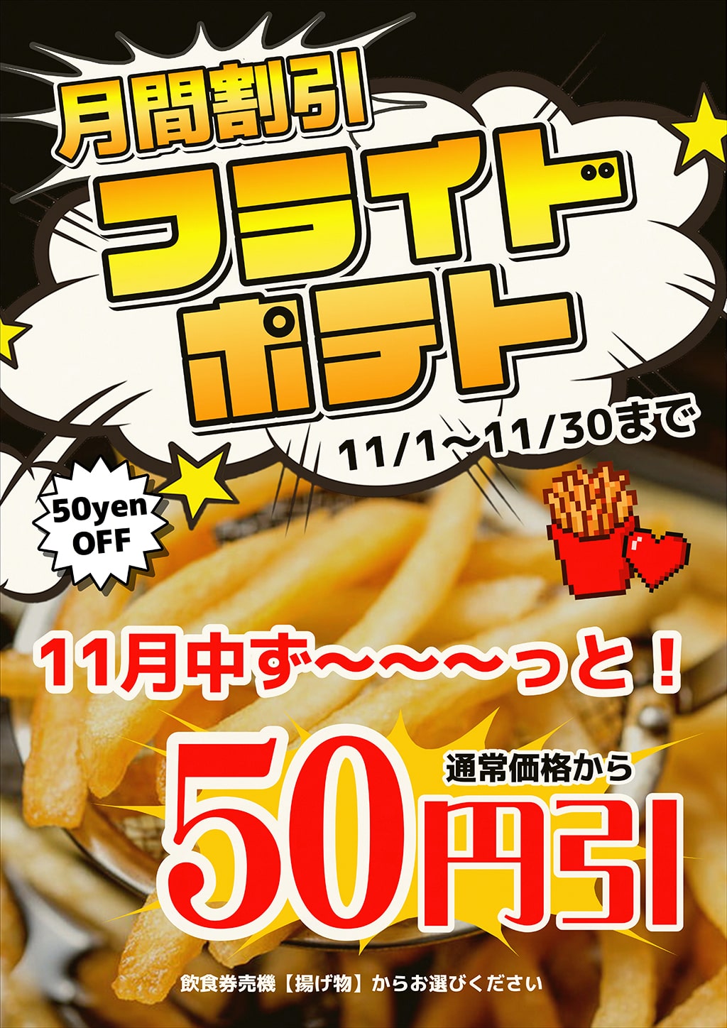 Home 期間限定メニュー フライドポテト割引 11/1(土)~11/30(日) フライドポテト割引 11/1(土)~11/30(日) 2025.11.1 期間限定メニュー 《期間限定》うれしい50円割引!! 食欲の秋が到来! いつもよりおトクなこの期間に、ほっくほくで、あっつあつなフライドポテトを味わっちゃおう! はいどーぞ! うまいね~🎵 揚げたて!アツアツ!召っしあがれ💕 🍟フライドポテト50円割引 通常価格:会員 430円 / 一般 480円 特別価格:会員 380円 / 一般 430円 Post