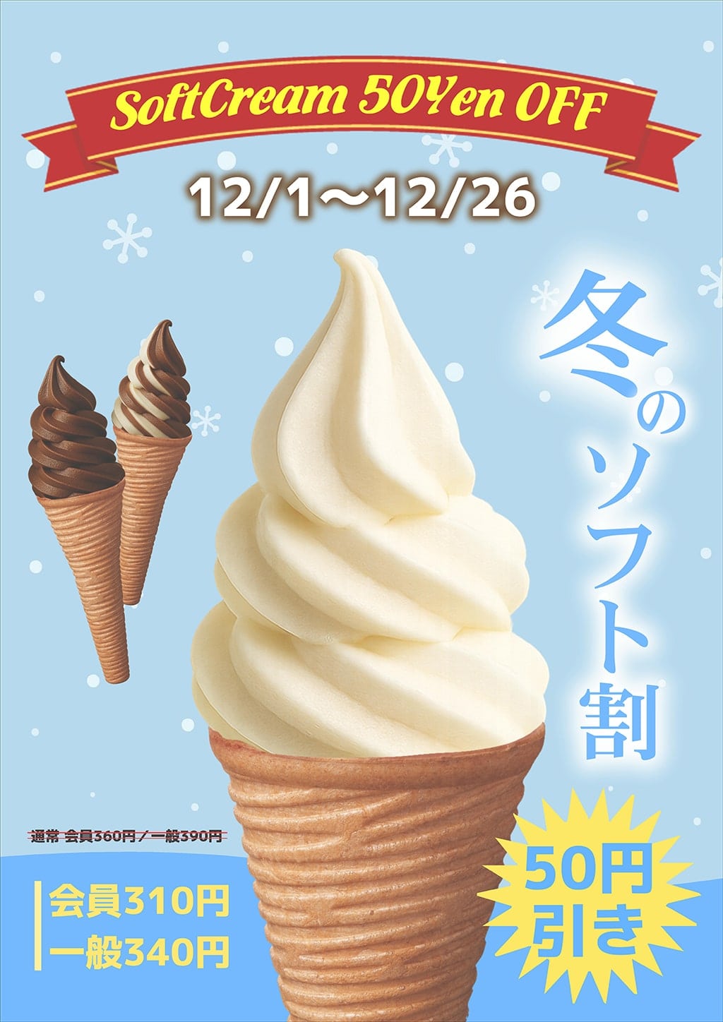 Home 期間限定メニュー ソフトクリーム割引 12/1(月)~12/26(金) ソフトクリーム割引 12/1(月)~12/26(金) 2025.12.1 期間限定メニュー 期間限定で50円引き♪ お風呂の後にひんやりタイム♪ 湯快爽快たや店のお食事処オススメ、北海道ミルクをふんだんに使用したソフトクリームを是非ご賞味下さいね🐧 甘~いシアワセ♡ ✨ソフトクリーム 会員 360円 / 一般 390円 50円引き♪ → 会員 310円 / 一般 340円 Post