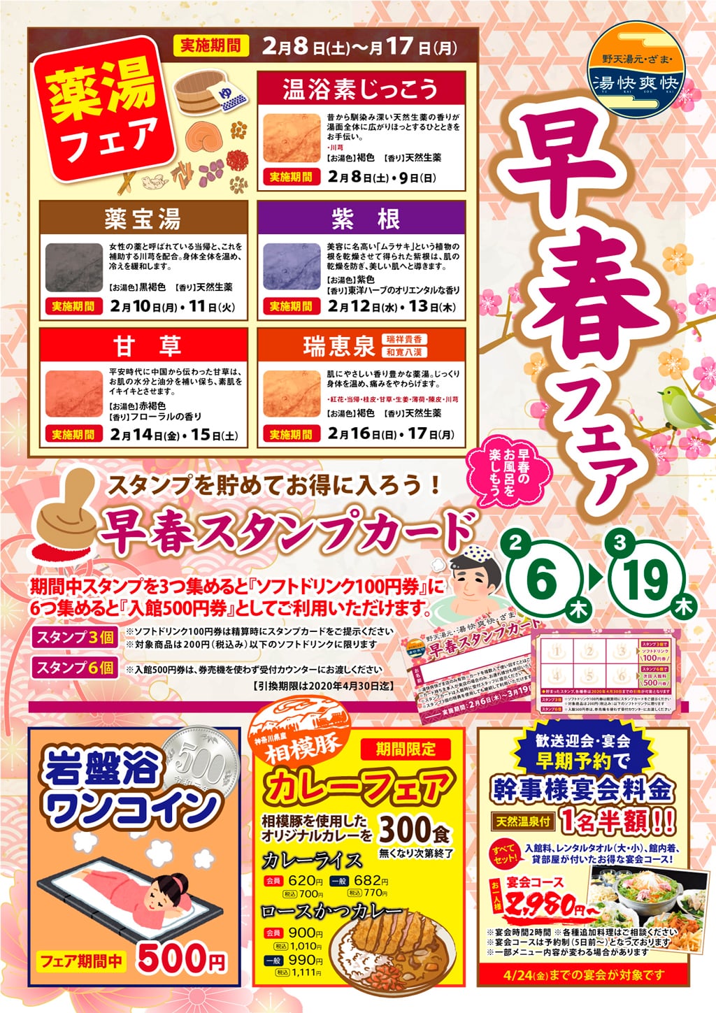 - 薬湯フェア開催!湯快爽快ざま店自慢の「源泉あつ湯」にて数種類の生薬を配合した特別薬湯をご堪能ください♪ 温浴素 じっこう・・・2/8(土)・9(日) 天然生薬 薬宝湯・・・2/10(月)・11(火) 伝統薬湯 紫根エキスの湯・・・2/12(水)・13(木) 伝統薬湯 甘草エキスの湯・・・2/14(金)・15(土) 特別薬湯 瑞恵泉・・・2/16(日)・17(月)