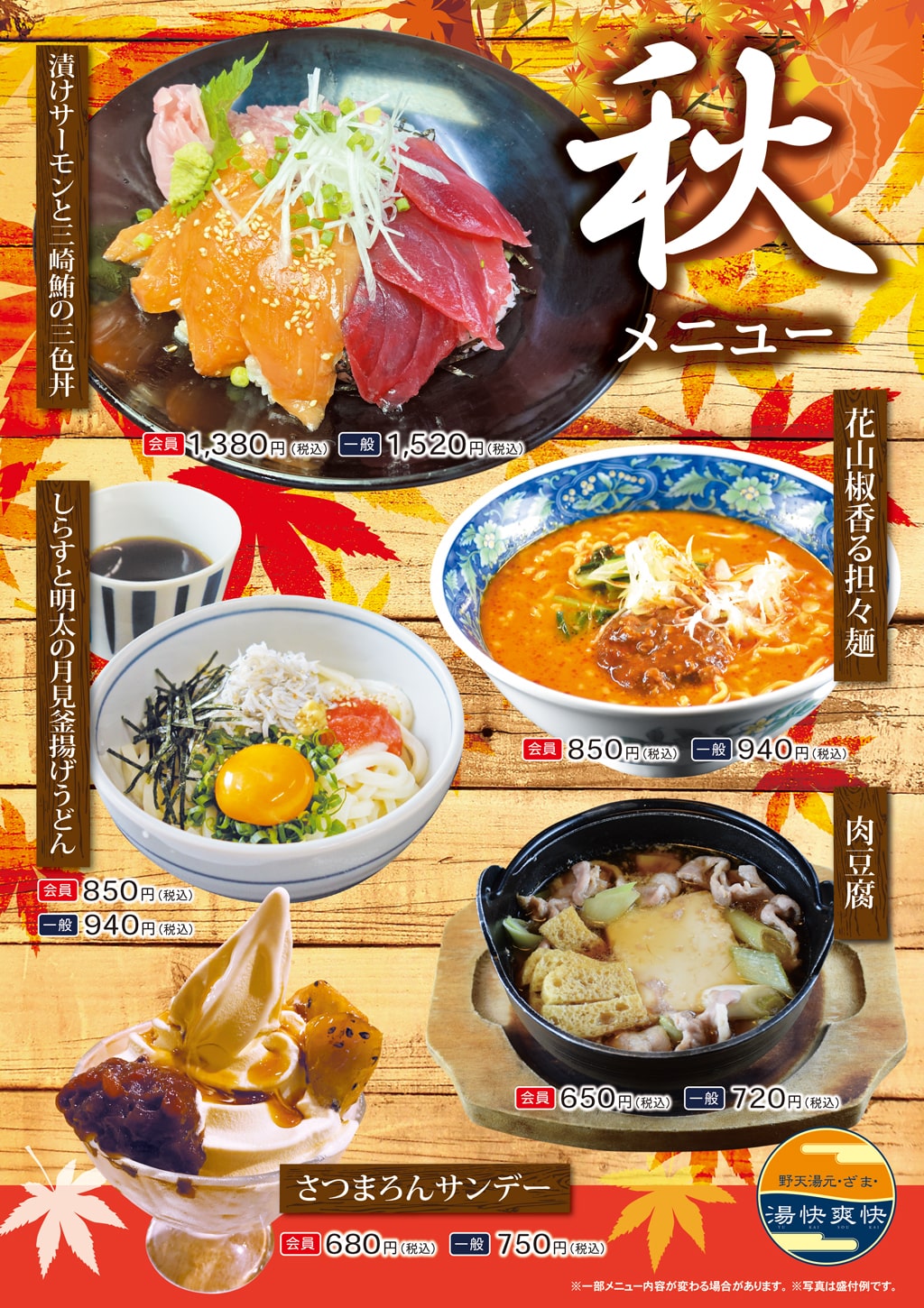 2025年9月22日 / 最終更新日時 : 2025年9月17日 takei NEWS & TOPICS 【期間限定】秋メニュー 美味しい旬の味覚が勢ぞろい 期間限定 秋メニュー登場! 湯快爽快ざま店、季節限定の秋メニューが始まります🙆🙆 秋はのんびりとお風呂♨を楽しんで、一緒に食欲の秋も味わいましょう🍁 お品書き 🎑漬けサーモンと三崎鮪の三色丼 会員 1,380円 / 一般 1,520円 🎑花山椒香る担々麵 会員 850円 / 一般 940円 🎑しらすと明太の月見釜揚げうどん 会員 850円 / 一般 940円 🎑肉豆腐 会員 650円 / 一般 720円 🎑さつまろんサンデー 会員 680円 / 一般 750円 他の季節メニューはこちら 共有: