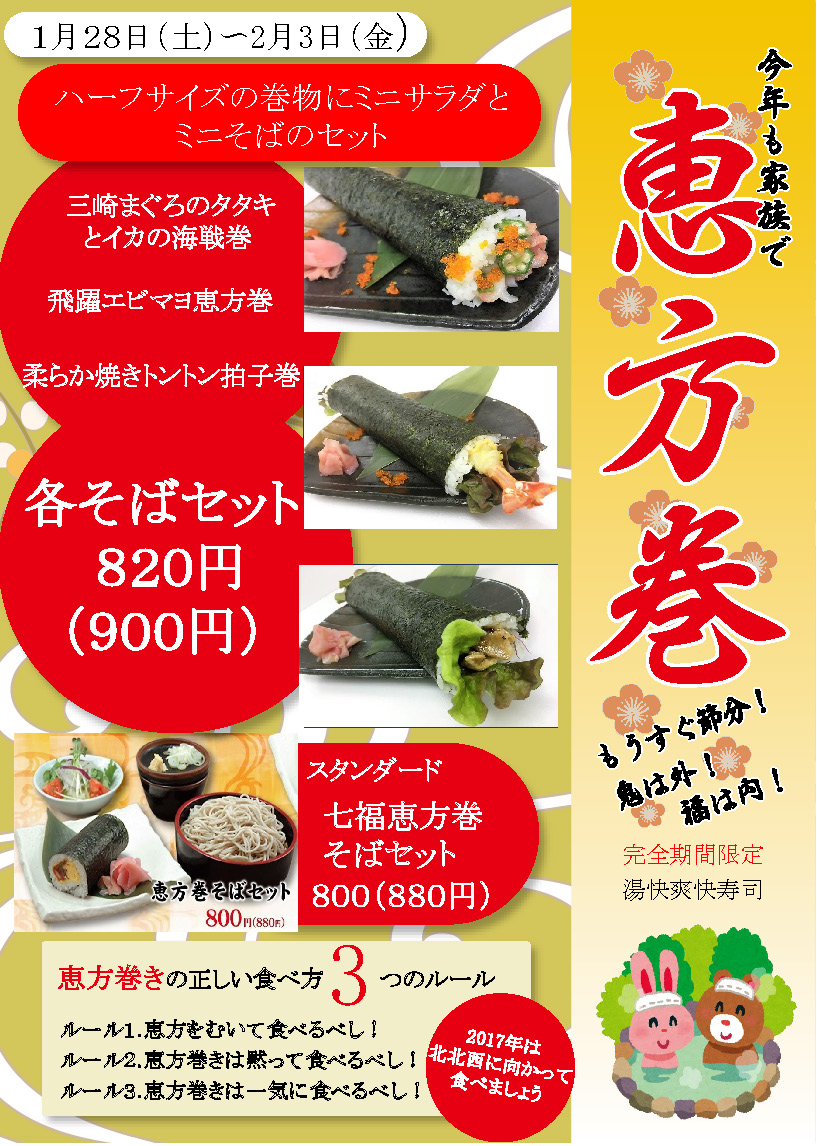 節分の恵方巻はぜひ、湯快爽快ざまのお食事処で! 今年は4つの味をご用意しております。