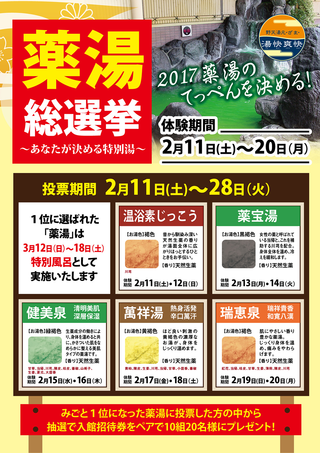 2017年2月3日 / 最終更新日時 : 2017年2月3日 okubo このイベントは終了しました 薬湯総選挙 イベント詳細 日付: 2017年2月11 – 28日 カテゴリ: このイベントは終了しました あなたが決める特別湯 ~ 薬湯総選挙 2/11(土)~2/28(火) 体験期間: ~2/20(月) 投票期間: ~2/28(火) 湯快爽快ざま、2017年の薬湯の頂点はどの風呂に? 選りすぐりの5種類の薬湯から最も好きなものを選んで投票してください。 見事1位になったお風呂は、3/12(日)~3/18(土)の特別風呂として再登場。 また1位になったお風呂に投票した方の中から抽選でペアで10組20名様に、湯快爽快ざまの入館招待券をプレゼント!共有: