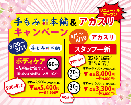 2017年3月21日 / 最終更新日時 : 2017年3月21日 okubo このイベントは終了しました アカスリキャンペーン イベント詳細 日付: 2017年4月1 – 10日 カテゴリ: このイベントは終了しました さくらフェア アカスリキャンペーン 4/1(土)~4/10(月)の期間限定! スタッフ一新、リニューアルオープン 30分コース 通常 会員3,600円 / 一般4,100円 → 会員3,300円 / 一般3,800円 70分コース 通常 会員8,700円 / 一般9,700円 → 会員8,000円 / 一般9,000円 さらに ・ヨーグルトマッサージ ・足かかと角質処理 ・顔コラーゲンパック をサービスいたします。 この機会をお見逃しなく! さくらフェアのイベント一覧はこちら » 共有: