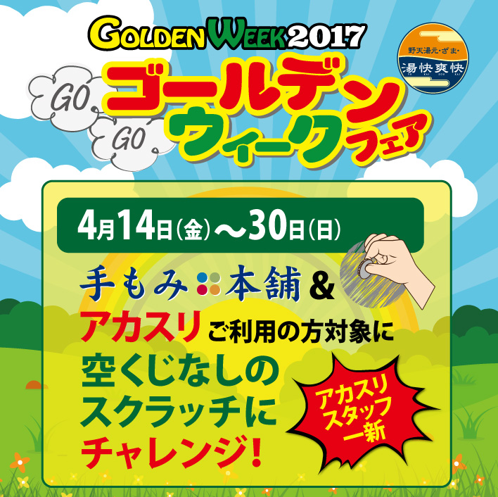 2017年4月14日 / 最終更新日時 : 2017年5月15日 okubo このイベントは終了しました 手もみ&アカスリ スクラッチ! イベント詳細 日付: 2017年4月14 – 30日 カテゴリ: このイベントは終了しました GO!GO!GWフェア 手もみ&アカスリ スクラッチ! 4月14日(金)~4月30日(日) なんと外れナシ!! スタッフ一新!リニューアルした手もみ本舗&韓国式アカスリでは4月14日(金)~4月30日(日)に空くじナシのスクラッチを配布いたします。 整体・アカスリの30分券(各5本)やプレミアムモルツ1ケース、ドールのアップル1ケースなど豪華な賞品盛りだくさん! GO!GO!GWフェア詳細はこちら » 共有: