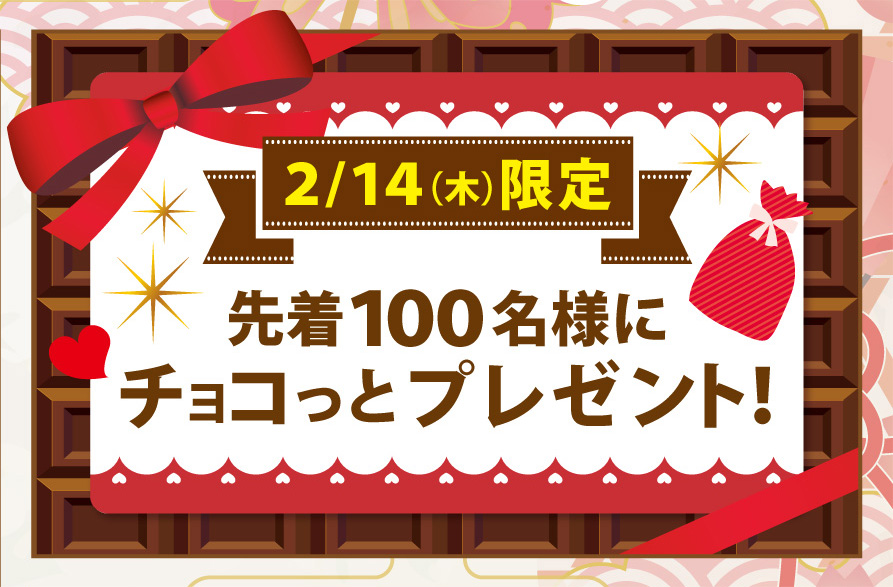 2019年2月1日 / 最終更新日時 : 2019年2月1日 okubo このイベントは終了しました チョコっとプレゼント イベント詳細 日付: 2019年2月14日 カテゴリ: このイベントは終了しました チョコっとプレゼント 2/14(木) 先着100名様 限定 ハッピーバレンタイン! 先着100名様にチョコっとプレゼント! 共有: