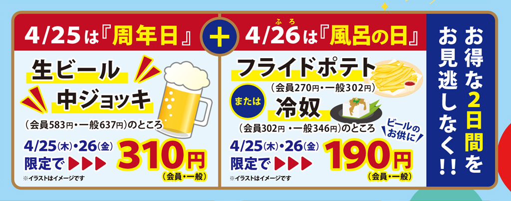 2019年3月26日 / 最終更新日時 : 2019年4月25日 okubo このイベントは終了しました 生ビール&おつまみ 割引き イベント詳細 日付: 2019年4月25 – 26日 カテゴリ: このイベントは終了しました 生ビール&おつまみ 限定割引き! 4/25(木)~4/26(金) お得な2日間をお見逃しなく!! 湯快爽快ざま店のお楽しみはお風呂だけじゃない! 湯っくり湯ったり癒された後は、お食事処のビールも楽しんじゃいましょう! 4月の「いい風呂の日」は・・・ 湯快爽快ざま店開業19周年を記念した、「周年日」と合わせて2日間の特別大サービス!生ビールでグイっと1杯&ビールのお供に外せないおつまみも、大特価でお得にお召し上がりくださいね♪共有:
