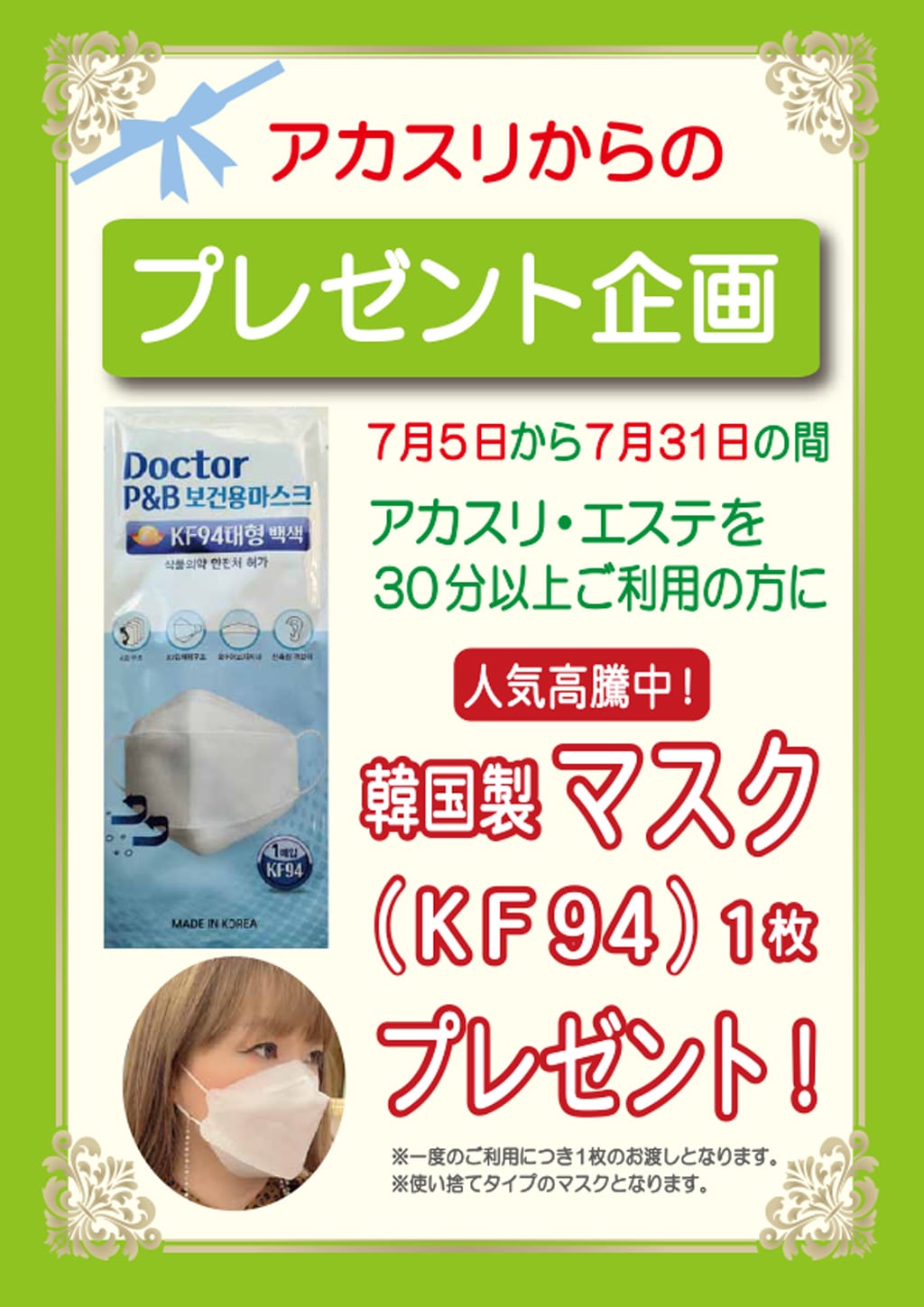 アカスリ・エステを30分以上ご利用の方に、『韓国製マスク(KF94)』1枚プレゼント!